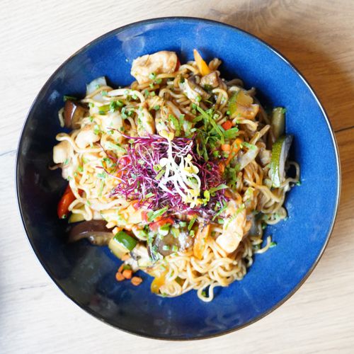 gebratene Nudeln mit Chicken, verschiedenem Gemüse in Soja Soße 9,90